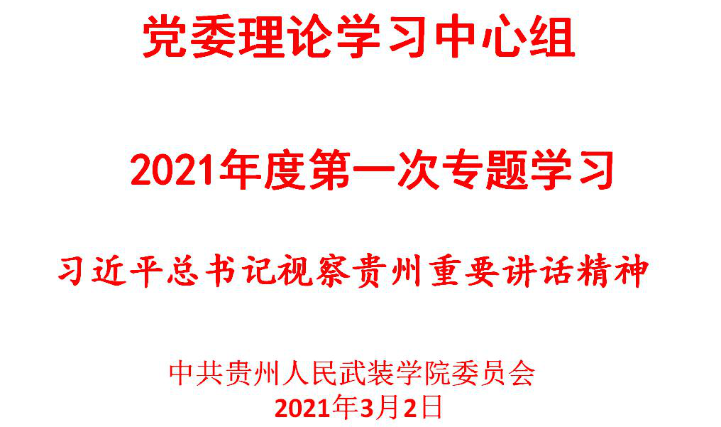 冯建书记说,习近平总书记视察贵州,是贵州发展史上具有里程碑意义的大事,饱含了总书记对贵州的特别关怀厚爱,给予了对贵州各项工作的充分肯定,寄予了对新时代贵州发展的新期待新要求,为我们开启新征程、开创新未来提供了行动纲领、指明了前进方向、明晰了目标路径、注入了强大动力。我们要不断强化感恩意识,更加自觉增强“四个意识”、坚定“四个自信”、坚决做到“两个维护”,把习近平总书记重要讲话精神作为一切工作的根本遵循,进一步完善工作思路、抓实工作重点,进一步振奋精神、以昂扬的斗志,更加信心满满地秉承“忠诚、担当、进取、奉献”的人武精神,践行新发展理念、开拓新发展路径,全面推动学院高质量发展,为构建“多元融合、高效联动”的育人新格局奋力前行。 冯建书记要求,学院各党总支(党支部)要把学习宣传贯彻落实习近平总书记视察贵州重要讲话精神作为首要政治任务和长期战略任务,加强组织领导,学习上要学深悟透,宣传上要深入人心,调研上要深入扎实,贯彻上要落地见效,持续掀起学习宣传贯彻的热潮。 冯建书记强调,要把习近平总书记视察贵州重要讲话精神作为我们当前和今后发展的总遵循、总纲领、总指针,扎扎实实把学院各项工作抓牢抓实,全力以赴推动习近平总书记重要讲话精神在学院落地生根、开花结果。要按照党中央要求高标准高质量开展好党史学习教育,要按照省委部署扎实开展“牢记殷切嘱托、忠诚干净担当、喜迎建党百年”专题教育,在新时代的长征路上夺取新的更大胜利,以优异成绩迎接建党100周年。