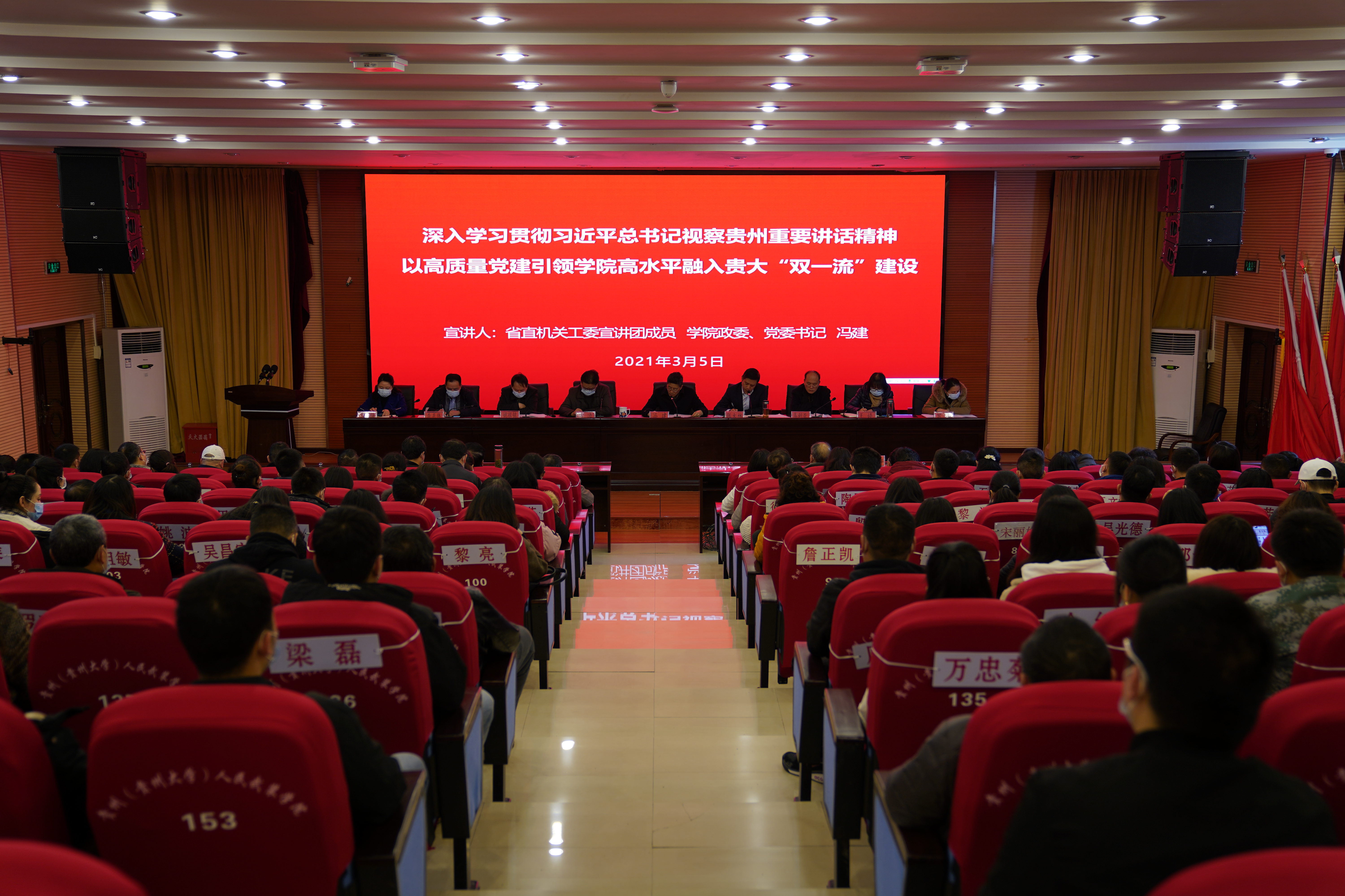 深入学习贯彻习近平总书记视察贵州重要讲话精神以高质量党建引领学院高水平融入贵大“双一流”建设3月5日下午,学院在综合楼多功能厅举行主题为《深入学习贯彻习近平总书记视察贵州重要讲话精神,以高质量党建引领学院高水平融入贵大“双一流”建设》宣讲报告会。省直机关工委宣讲团成员、beat365手机官方网站政委、党委书记冯建主讲,并对新学期开学工作作安排部署。会议由学院院长张大林主持。