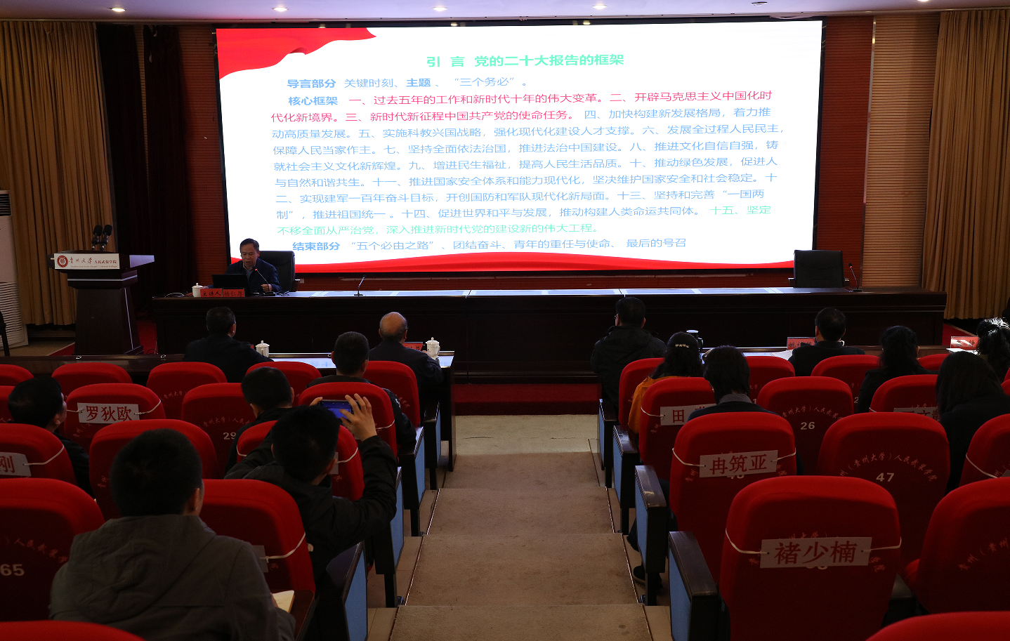 报告会指出,举办学习贯彻习近平新时代中国特色社会主义思想主题教育读书班,要学出坚定信念,学出绝对忠诚,学出感恩奋进,学出大任担当,学出过硬作风,学出创新本领,学出整改发展,学出为民情怀,学出勤政廉洁。通过学深悟透习近平新时代中国特色社会主义思想,更加深刻领悟“两个确立”的决定性意义,衷心拥护“两个确立”、忠诚践行“两个维护”,推动学院主题教育走深走实。 报告会强调,要坚持原原本本学,学出思想政治新境界。要坚持带着问题学,提升干事创业硬本领。要坚持融会贯通学,锤炼忠诚实干敢担当。要把学懂弄通做实习近平新时代中国特色社会主义思想作为政治责任、精神追求、自觉习惯。要全面把握习近平新时代中国特色社会主义思想的科学体系;要与学院改革发展各方面的工作紧密结合起来;要切实推动全校上下严格对标对表;要以学铸魂、以学增智、以学正风、以学促干,以实干担当奋力谱写好多彩贵州现代化建设的人武学院新篇章。