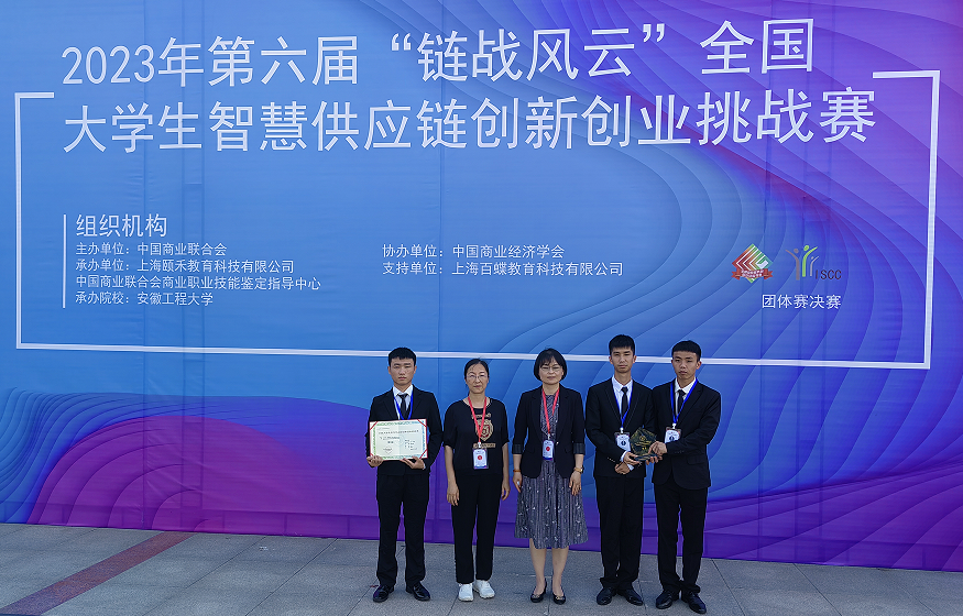 2023年“链战风云”第六届全国大学生智慧供应链创新创业挑战赛团体赛决赛在安徽工业大学举行,由beat365手机官方网站王婷教授等老师指导的社会国防系2020级物流管理专业学生柏标、陈榕、张凌翔、吴智翔4名同学组成的“突击小队”,在总决赛中荣获银奖。